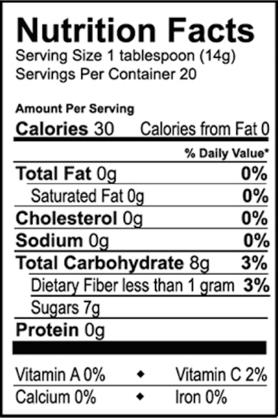 Our jams are healthy and delicious. The serving size is based on one tablespoon. Here is our nutritional info: